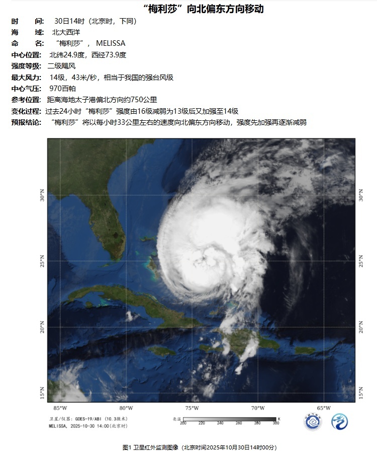 10月30日14时,“梅利莎”距离海地太子港偏北方向约750公里。