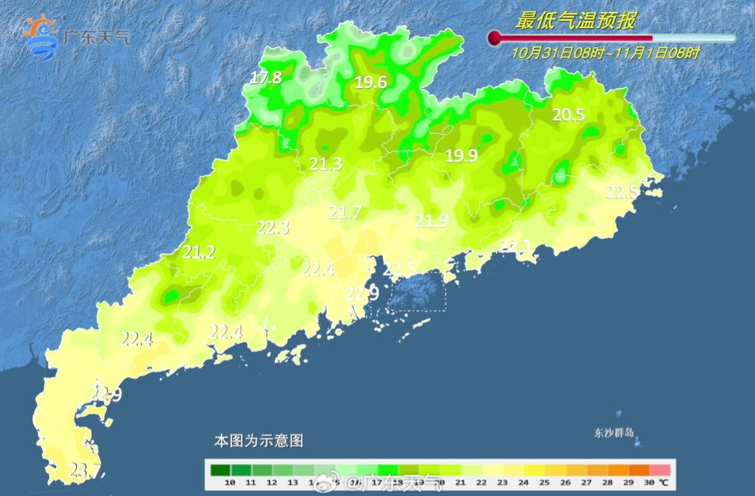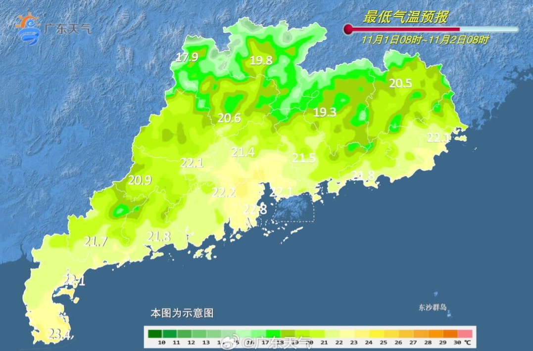 11月1日,珠江三角洲大部、雷州半岛南部、粤东、清远和韶关市县阴天间多云,有分散性零星小雨,其余市县多云到阴天,局部有小雨。最低气温:粤西、粤东和珠江三角洲市县20~23℃,其余市县15~19℃。