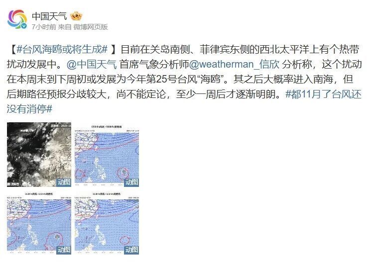 据“@中国天气”消息,目前在关岛南侧、菲律宾东侧的西北太平洋上有个热带扰动发展中。气象分析师分析称,这个扰动在本周末到下周初或发展为今年第25号台风“海鸥”。其之后大概率进入南海,但后期路径预报分歧较大,尚不能定论,至少一周后才逐渐明朗。