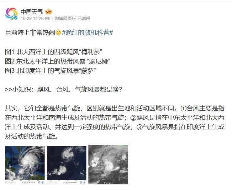 目前海上非常热闹,北大西洋上的四级飓风“梅利莎”、东北太平洋上的热带风暴“索尼娅”以及北印度洋上的气旋风暴“蒙萨”在海上共舞。