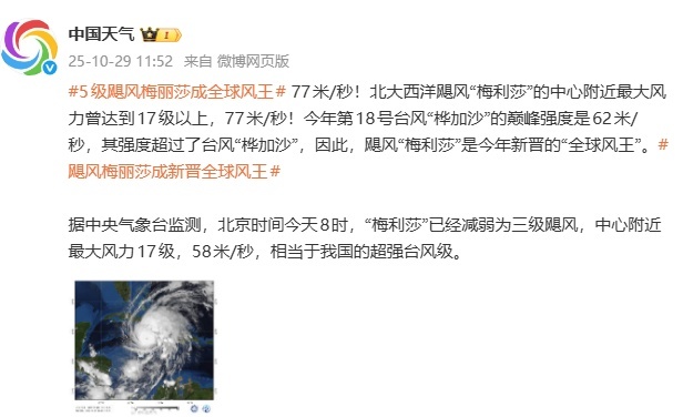 据“@中国天气”消息,北大西洋飓风“梅利莎”的中心附近最大风力曾达到17级以上,77米/秒;今年第18号台风“桦加沙”的巅峰强度是62米/秒,其强度超过了台风“桦加沙”,因此,飓风“梅利莎”是今年新晋的“全球风王”。
